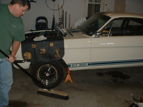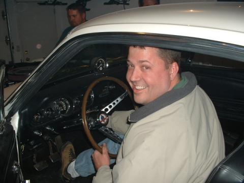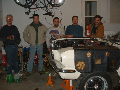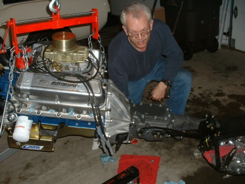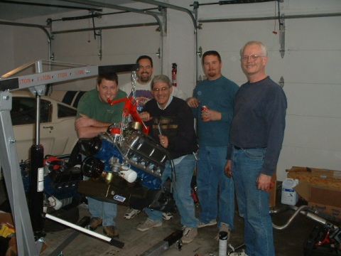 One wintery day, a bunch of guys (gearheads, actually) met up in the town of Des Moines, IA with not a lot to do except to help out someone in distress. It seems that Bob had Art make him an engine (331 stroker), ship it to him, and now it had to go into Bob's car. Piece of cake. Well, it would have been, except that the icy roads prevented all of the locals from showing up. So, with folks driving or flying from miles away, the group got together and made it a day's project. Here's Art after the clutch and tranny were installed onto the engine.