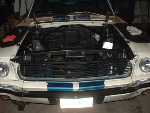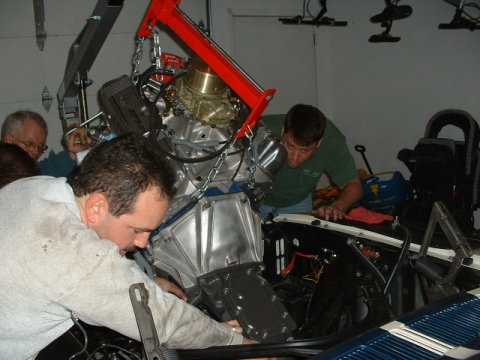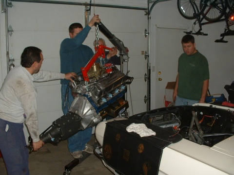 Hoisting the engine up and around. Notice the alternative transportation on the upper right Bob had to use while the car was engineless.