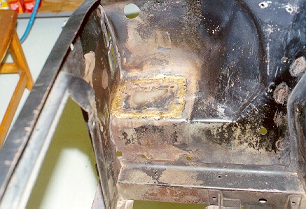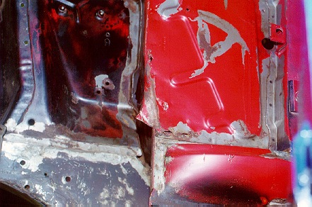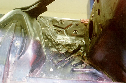 And now for the very peculiar and perverse. The PO cut the panel adjacent to the trap door going to the trunk for an unknown reason. What's wierd is that the cut isn't all the way through the metal, as it still is intact up high. Whoever tried to weld didn't know how to do anything, as there's a 1/2" gap, and very bad welds. Why was it cut? Was it moved forward for the floor support? Who knows, but it'll take some effort to straighten out. The left is from the interior; the right is looking from the trunk. The PO also painted the area in the trunk surrounding the trap door black. I guess he figured he couldn't remove four bolts to remove the trap door.