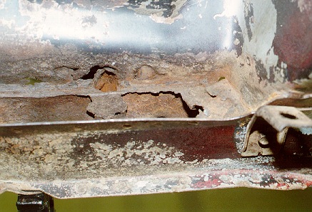 Still not had enough? You ready for the dreaded "shock tower" disease? This was caused by lube grease getting down onto the rail and clogging up the drain hole. Once that happens, water just sits, and rusts away everything. This is on the driver's side. The passenger side is perfect, considering the age.