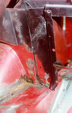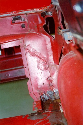 Midlife once had an accident, apparently to the right front corner. The radiator support and passenger front apron were replaced with Ford sheet metal (remnants of yellow stenciled numbers remain). The rear passenger side fender apron was not replaced. Here's a view from the inside, then the outside. It's buckled pretty bad. I hope to cut out most of it, leaving the very top section with the VIN and the hood spring support area.